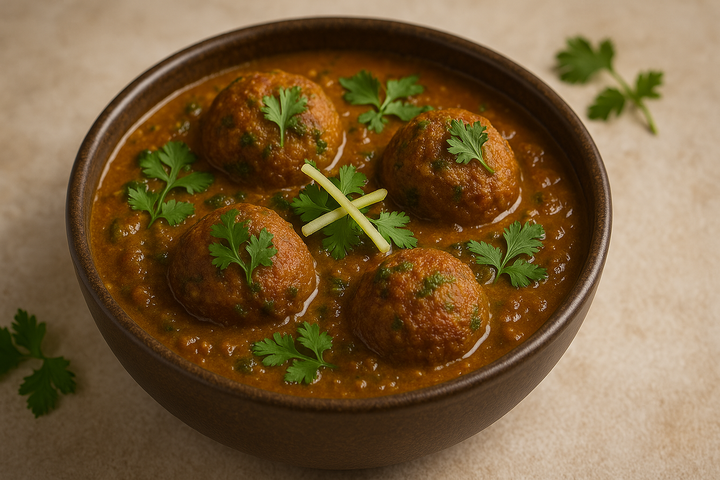 Malai Kofta – A rich and indulgent North Indian delicacy featuring soft, melt-in-your-mouth kofta (fried dumplings made of mashed potatoes, paneer, and spices) served in a creamy, mildly spiced tomato-cashew gravy. The luxurious sauce is finished with a swirl of cream and garnished with fresh cilantro, making each bite a perfect balance of flavor and texture.