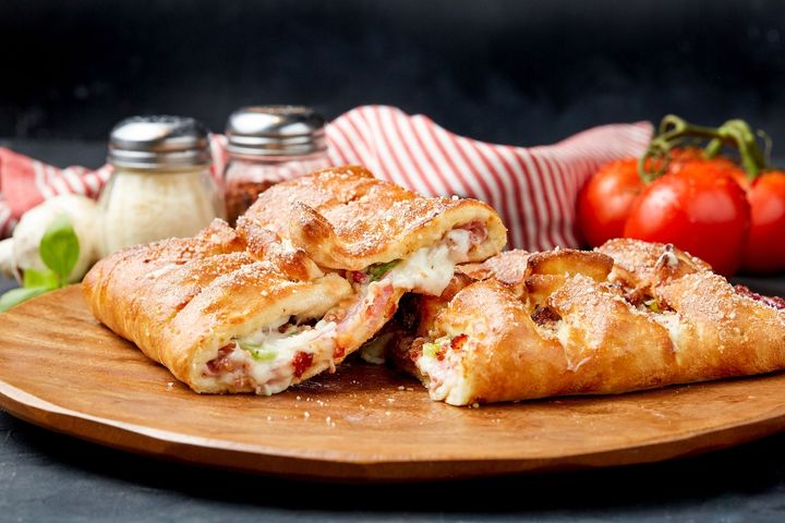 The Great Stromboli (Canadian Bacon, Bacon, Onions, Green Peppers & Ranch baked into a golden brown crust.)